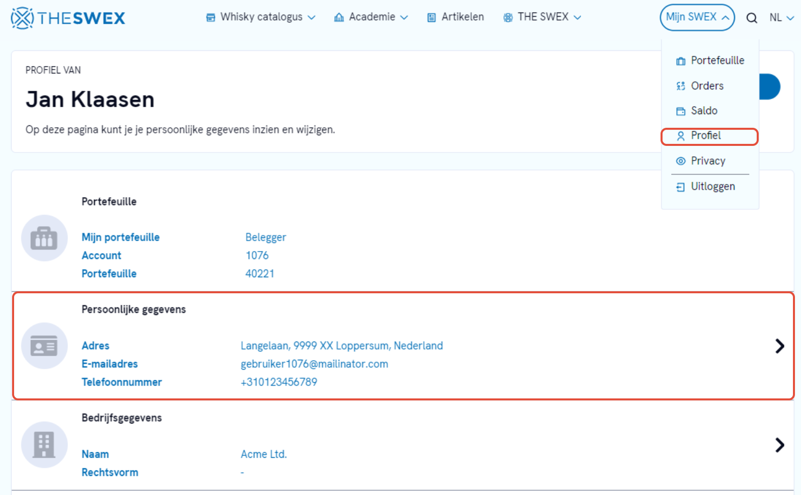 1. Ga naar het menu 'Mijn SWEX' en selecteer 'Profiel'