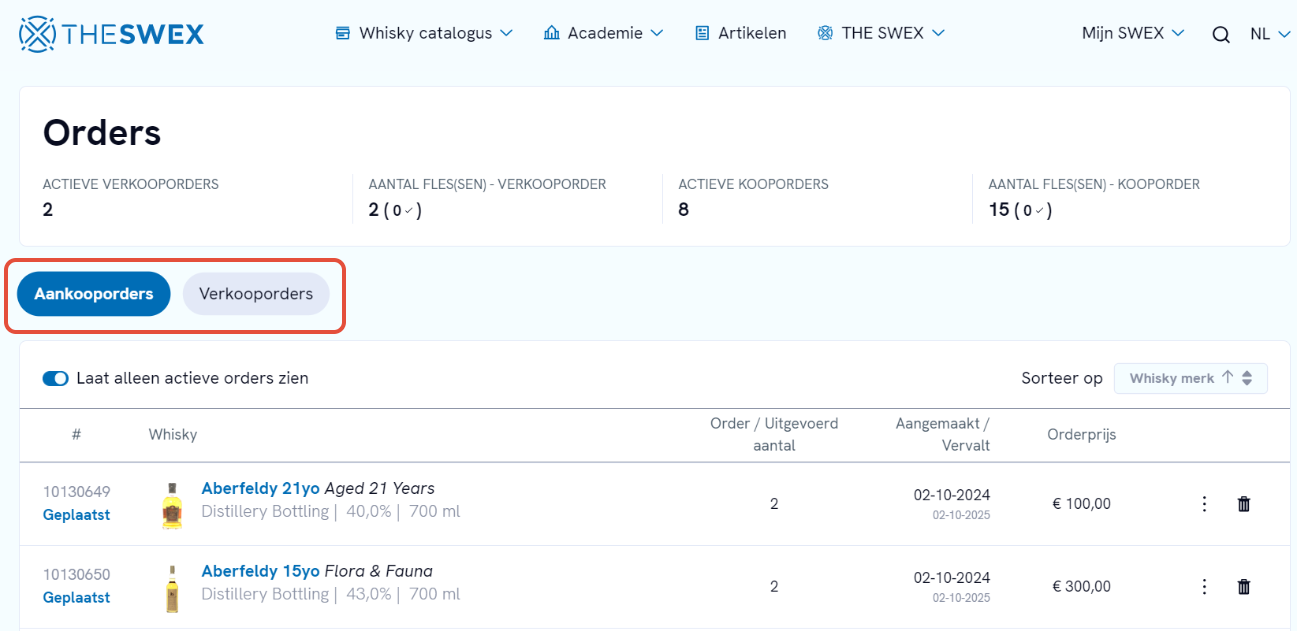 3. Je kunt kiezen tussen 'Aankooporders' en 'Verkooporders'. Hier kun je de status zien van uw orders.